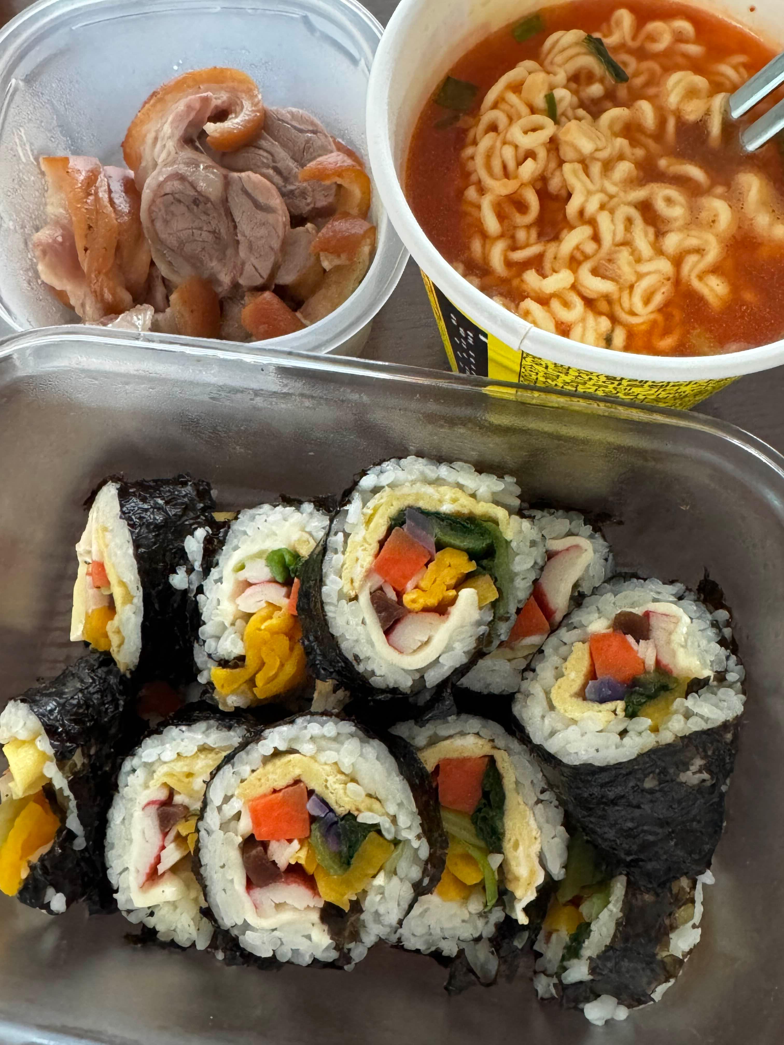 집 김밥과 진라면 소컵 그리고 가게에서 파밍해온 족발